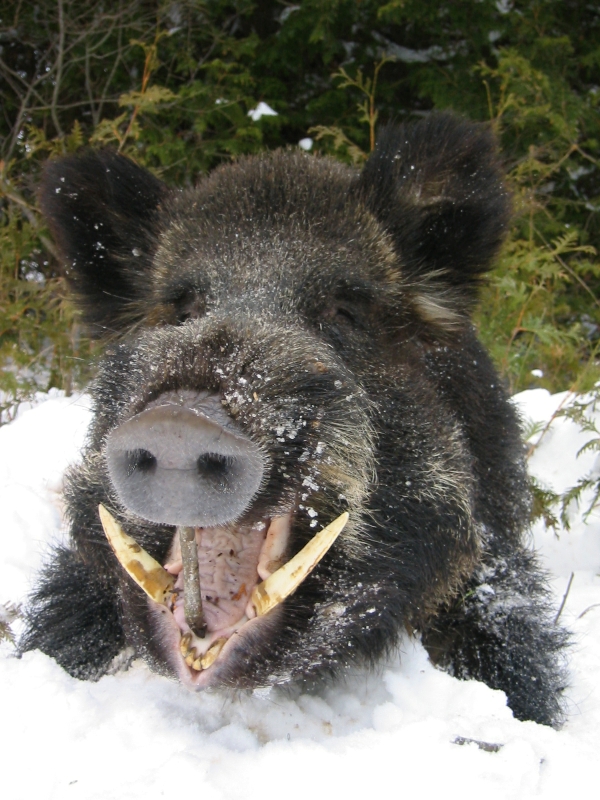 Experienced hunters say that wild boar can be even more dangerous to hunt than a bear. Equipped with thick, razor-sharp tusks, and a razor-sharp mind (hogs are the 4th most intelligent animal in the world) a wild boar can weigh a staggering 660 lbs and exhibit extremely aggressive and unpredictable behaviour.
